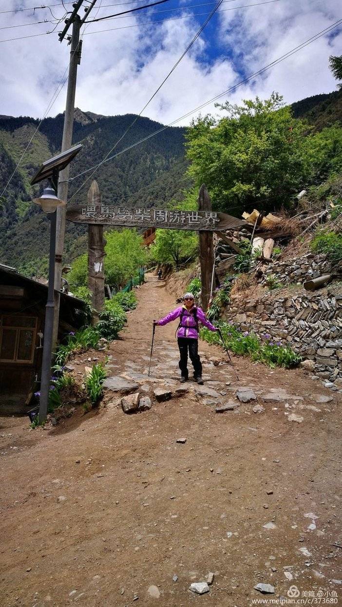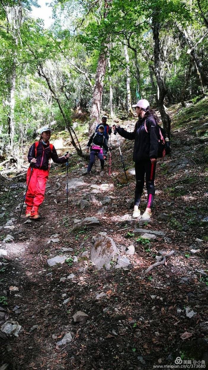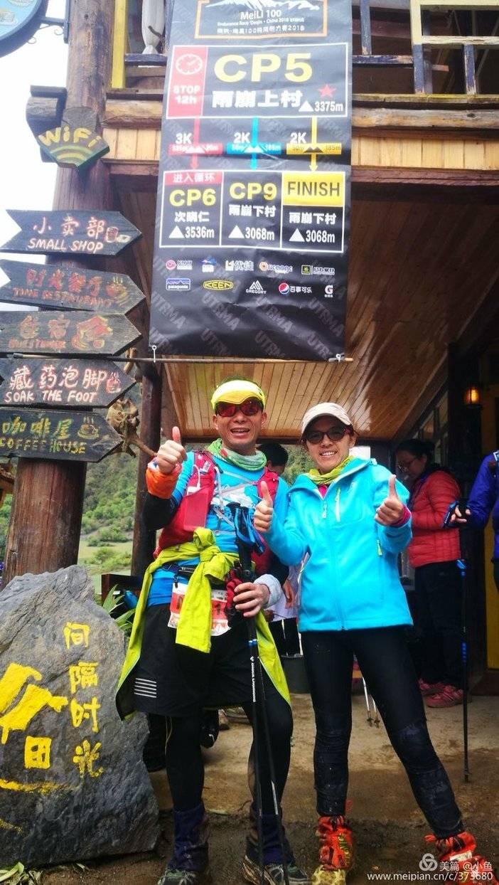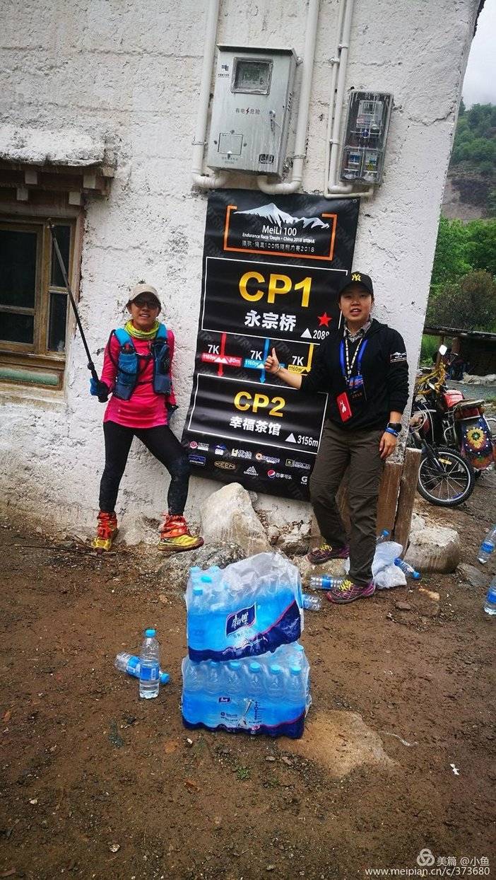 不知不觉,很快到了CP1,遇到志愿者希希(来梅里雪山的前几天通过杨哥加的蒙自微友),一起合了张影。这个点不用打卡,几分钟休整后,我取出登山杖开始赛程中第一段艰难的长上坡。