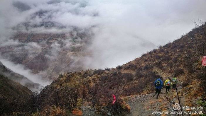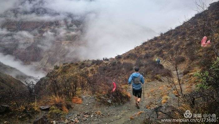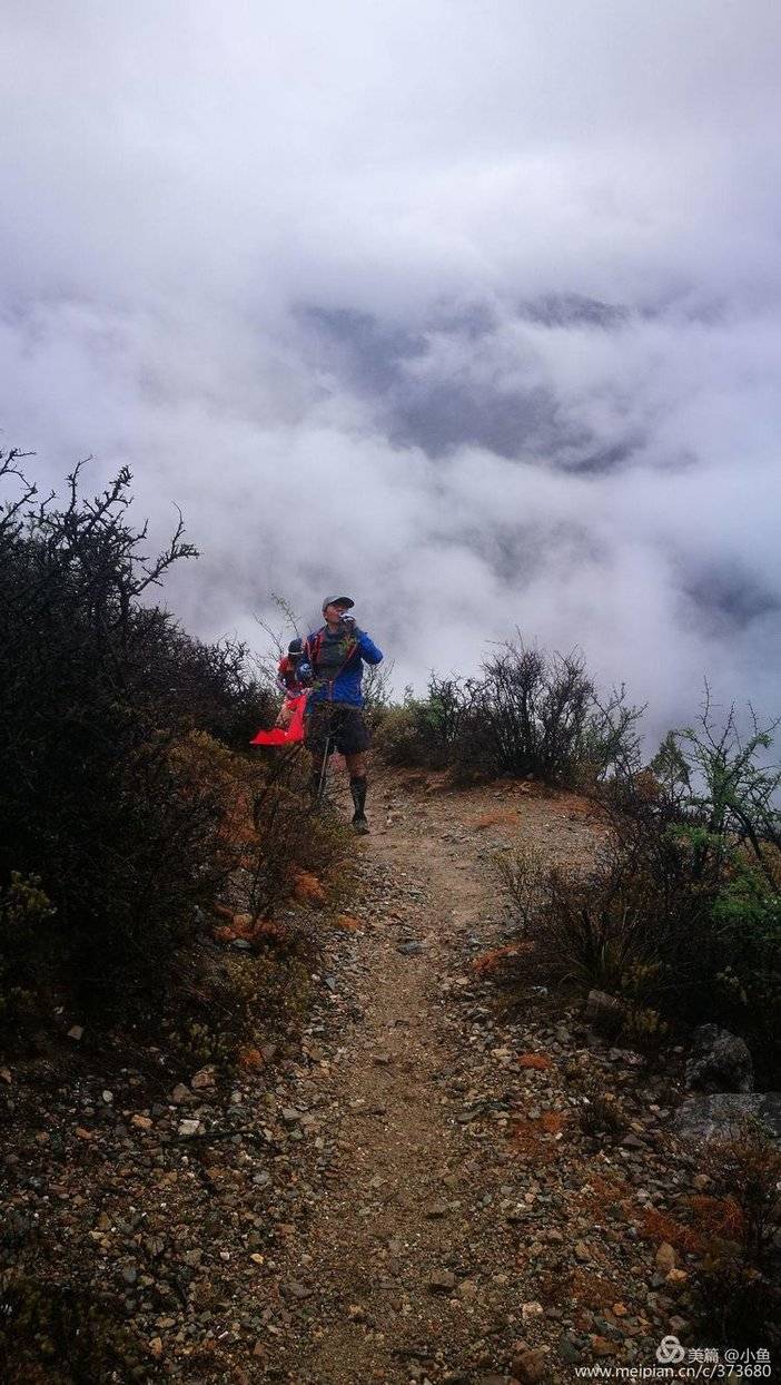 这一段下山坡陡地湿路滑,原本就很难下脚的路面,经冲在前头的众多高手N次蹂躏过后,更显泥泞不堪。我原计划是到了CP1后等上坡再用手杖,所以现在懒得拿出来,在较为陡滑的地方,只得靠肢体自身控制住平衡,小心翼翼地在确保安全的情况下横切着艰难的赛道向下奔突,因为才开赛,兴奋感还在,不断下降的海拔也给我提供了越来越充足的氧气,所以时不时还能超过几个正在紧张吃力地下坡的选手。可是这一段路上,清晨轻柔洁净的薄雾缭绕在山间美若仙境,我实在无法控制住想要停下拍照的欲望,只好一次次纵容自己停下来拍拍拍,导致好多后来者超到我前头去了。不过,我知道,这次我真的是来玩赛的,要玩好,要谨防高反,要安全完赛,对手不是别人,而是自己。只要一再这样提醒自己,拍照就心安多了。