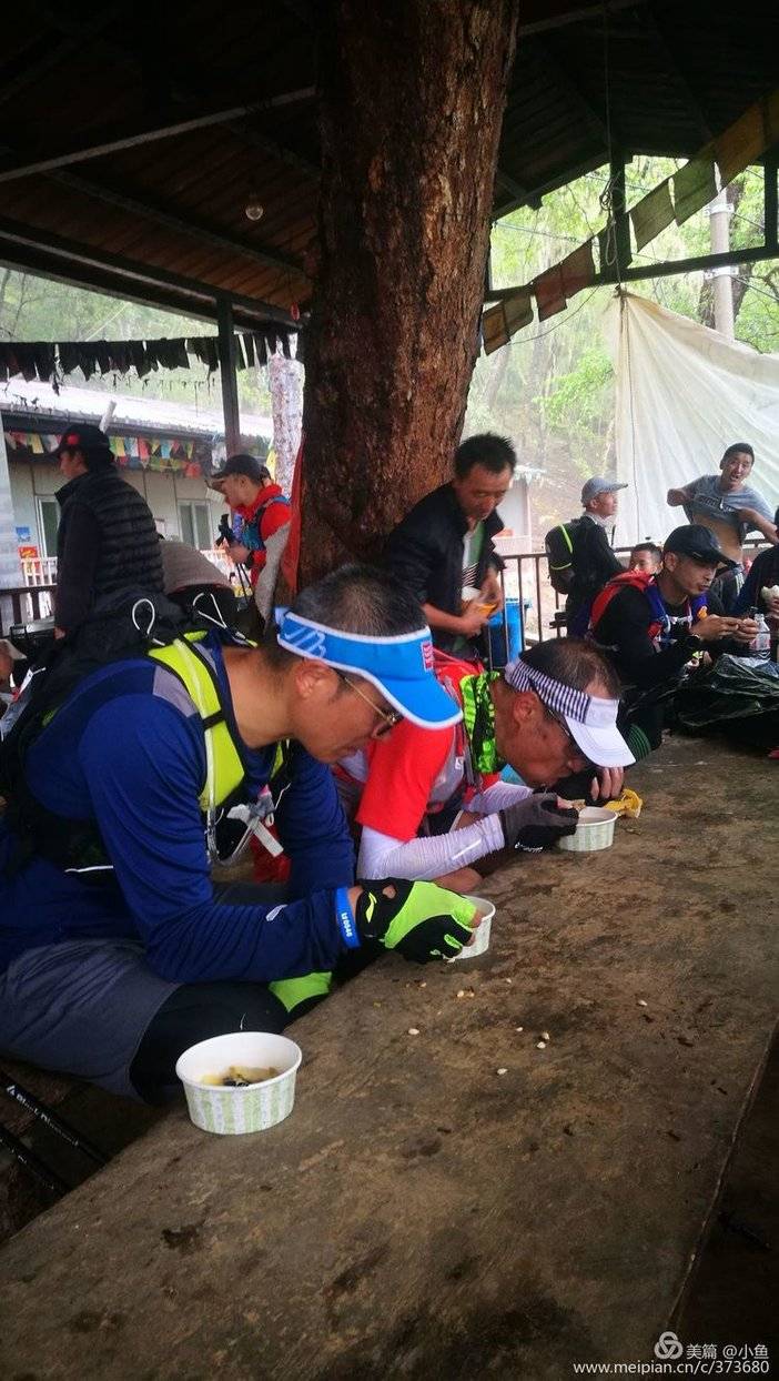 终于到了供应热食的补给站,第一件事就是赶紧发个朋友圈,告知关注我的朋友们我现在的状态主要是冷。我吃了一个蒸熟后又放在火炉旁烤香了的糖包子,喝了两碗酸菜洋芋汤,把水壶灌满,水袋里也加了一瓶饮料和一只能量胶,重新把上坡时嫌热脱下的外套穿上,准备继续上路,一位大哥(好像是志愿者)走过来说“你厉害哦,是同组第二个到这里的”,我“不可能哦,但我相信你是在鼓励我”,他想了想“嗯,那就是第三”,我“我前面肯定去了很多人了”,他仍不气馁“真的,至少也是第四,相信我”,我“哈哈哈,谢谢大哥的鼓励”。讲真,我这次确实没把成绩放在第一位,因为我更需要的是安全:旧伤别复发,高反别再犯,夜路别出事。