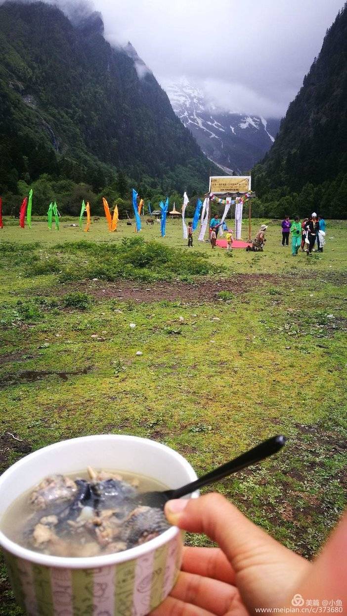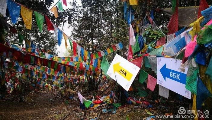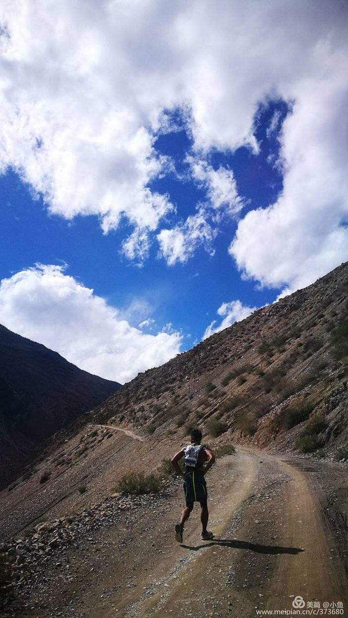 跑到CP9,看到30公里组的终点线就设在雪山脚下,透过拱门仰望梅里,突发想冲线的念头,于是请志愿者帮拍照,让我去玩了一把。30公里组实际里程只有26公里,前三名刚刚产生,此时我心里不禁有点小遗憾“可惜啊,要是当初我也报30公里组的话,能拿到第二名呀……”,再看看现在自己的情形,拿不到好名次不说,接下来还有40多公里的赛程,连能否跑完都还是未知数,唉……感叹归感叹,自己报的名,咬牙切齿也得努力坚持下去呀,于是喝了一碗鸡汤,嚼了几块鸡肉,发了两条朋友圈,继续艰难的旅程。出站时志愿者小哥帮我查了一下实时排名,目前位列第四,嗯,这回倒是准确信息而并非单单是为鼓励我了,但我心里明白,赛事取名次前三,那么,基本上想要拿名次的都远远冲上前了,第四和最后一名完赛者是一样一样的,因为2016年普者黑28公里我就是第四,所以没啥感觉。所以我还是孤独地上路,孤独地体验路途中身心所感悟到的点点滴滴,反身观照内心,这才是我最初的意愿。