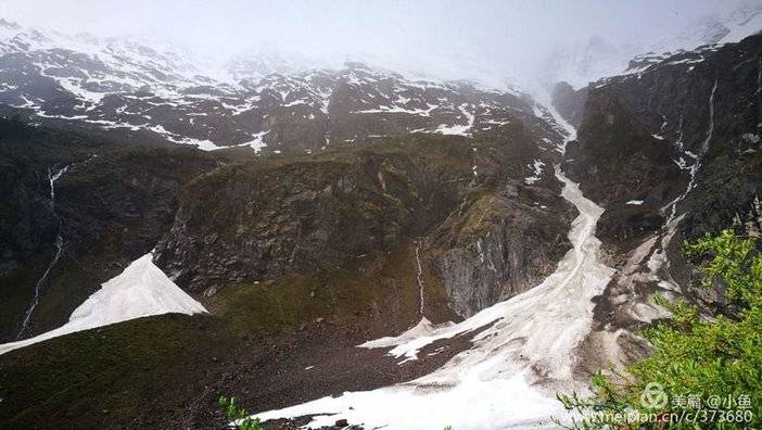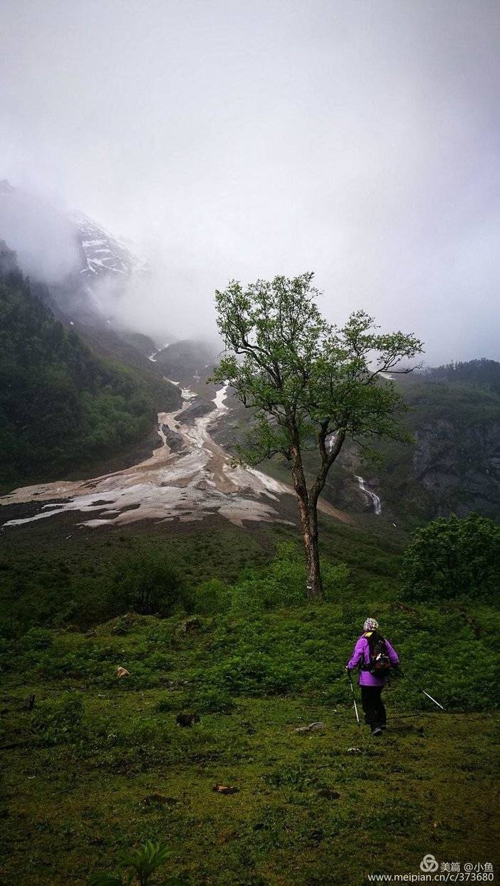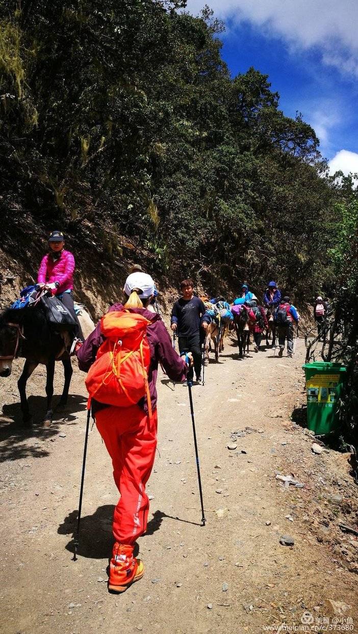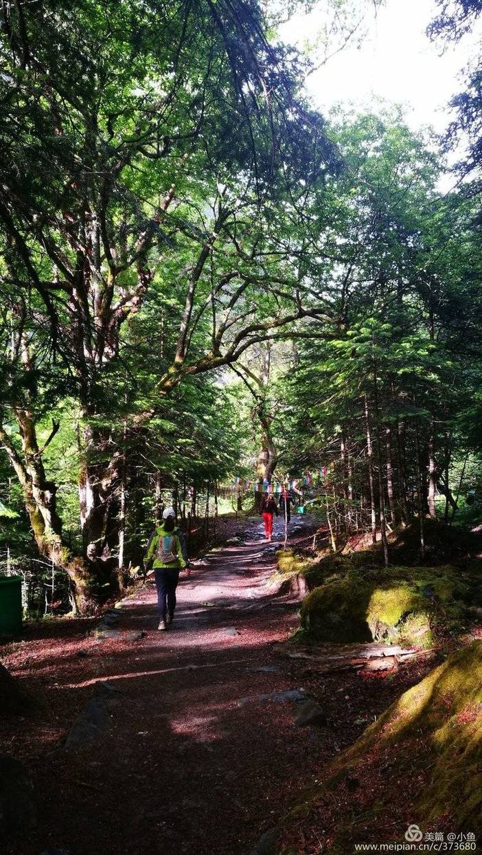 这段路林木葱郁,山河急湍,人烟稀少,而现在30公里组路线已截止,100公里组的大神们全都还在冰湖、神瀑那边奔走,如此说来,现在跑在我前面的只有65公里组的3名女子和10来个男子,想到这10多个人前前后后稀稀落落地分散在40多公里的山野间,孤独感倍增啊!还好现在大白天的,怕黑的我恐惧点还远远未曾到来。27号那日晴天,我们走过这里时,林子里小道上积满了松软的几厘米厚的尘土,现在经两天的雨水浇洒,灰尘沦为泥水,想快跑起来也不大容易,还是只有慢慢怼。路上会偶尔遇到从尼农方向骑马上来的游客,在狭窄险要的地方彼此交错时,马们自觉停蹄靠边礼让,人们真诚微笑加油点赞,而我满心感动更加勇敢。