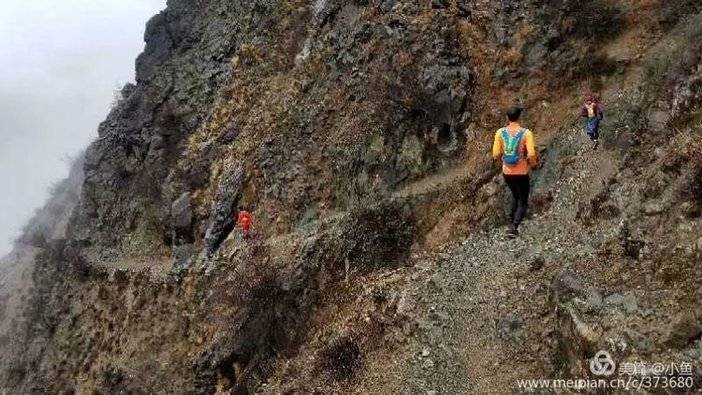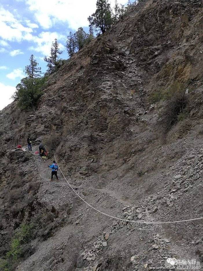 原以为恩慈她们应该不会走太远,可是让我追到天色黑透追到无望也还是没追得上,到了一处非常陡峭的坡,需要抓住一根绳子才能把身体往上送,头顶上方有电筒光向我照射,我也回应照了照,可是我不确定那根绳子是否牢固,就只好将双手扣进泥石里,双膝跪趴着费力地往电筒光方向挪爬,爬完了才知道他们是救援志愿者,因路段极为险峻在旁边照应。他们发现我是个女生时,给了我敬佩和鼓励的表达,还说“刚刚一个女生就在你前面不远”,我说“追不上了”,他说“她也蛮有压力的,说你会随时追上来”。