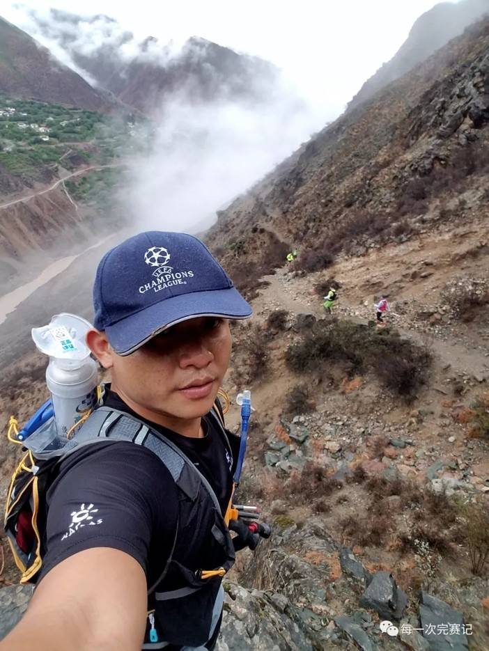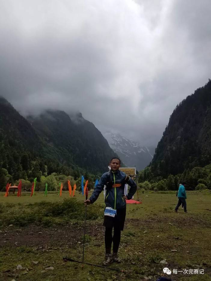 很快下到山底之后爬了一小段路就到CP1,在这里简单的补给后,就开始了上山的路程,这段山很高,感觉爬了很久,然后又到了第二个CP点,这些补给点的名字我已经忘了差不多了 只记得第一个永宗桥?反正我在补给点逗留的时间都很短,基本就是抓一把葡萄干和香蕉吞下,迅速喝饱水就开拔了,总之不会超过两分钟逗留,在赶路的过程中,我也会转过头看着补给点的这些跑友,他们是不是来度假的呢?翘着二郎腿,吹着牛逼的悠哉的吃着泡面?还有路上摆造型的朋友,总之也许就是一个人很孤独吧,所以唯一能做的就是低头赶路,我报的是60公里组我唯一一起和我来梅里的小伙伴报的是30公里,所以一开始我们就散了,每次比赛我都很重视,也许自己平时训练的时候可能跑一截走一截,不怎么认真,但只要比赛我就想认真的去参加,只有跑步的比赛对每一个人都是公平的,因为付出的汗水和成绩是成正比的,当终于站上CP3的山顶后,接下来上下雨崩的路其实都是坡,我也可以飞奔而下了,很舒服的下坡,因为连续的小雨天气,路很滑,但我也没法控制速度,就这样冲到了雨崩村30公里终点。问了一下工作人员好像是第3个还是第四个到这里的选手。自我感觉还行,小嘚瑟了一阵;看了一下时间离关门时间还有14个小时吧,心想14个小时跑30公里那不和玩一样吗,但还是没怎么完全放松警惕。